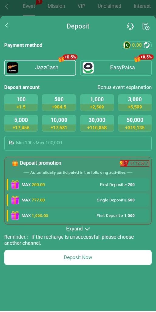 ZT777 supports Easypaisa, JazzCash, bank transfers, and in-app wallet deposits with low minimum amounts for convenience.